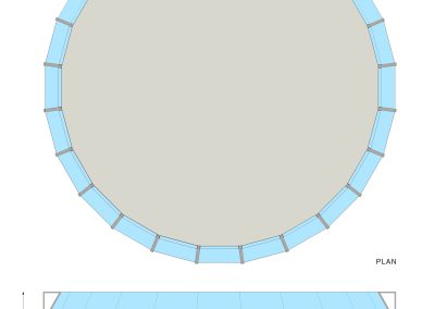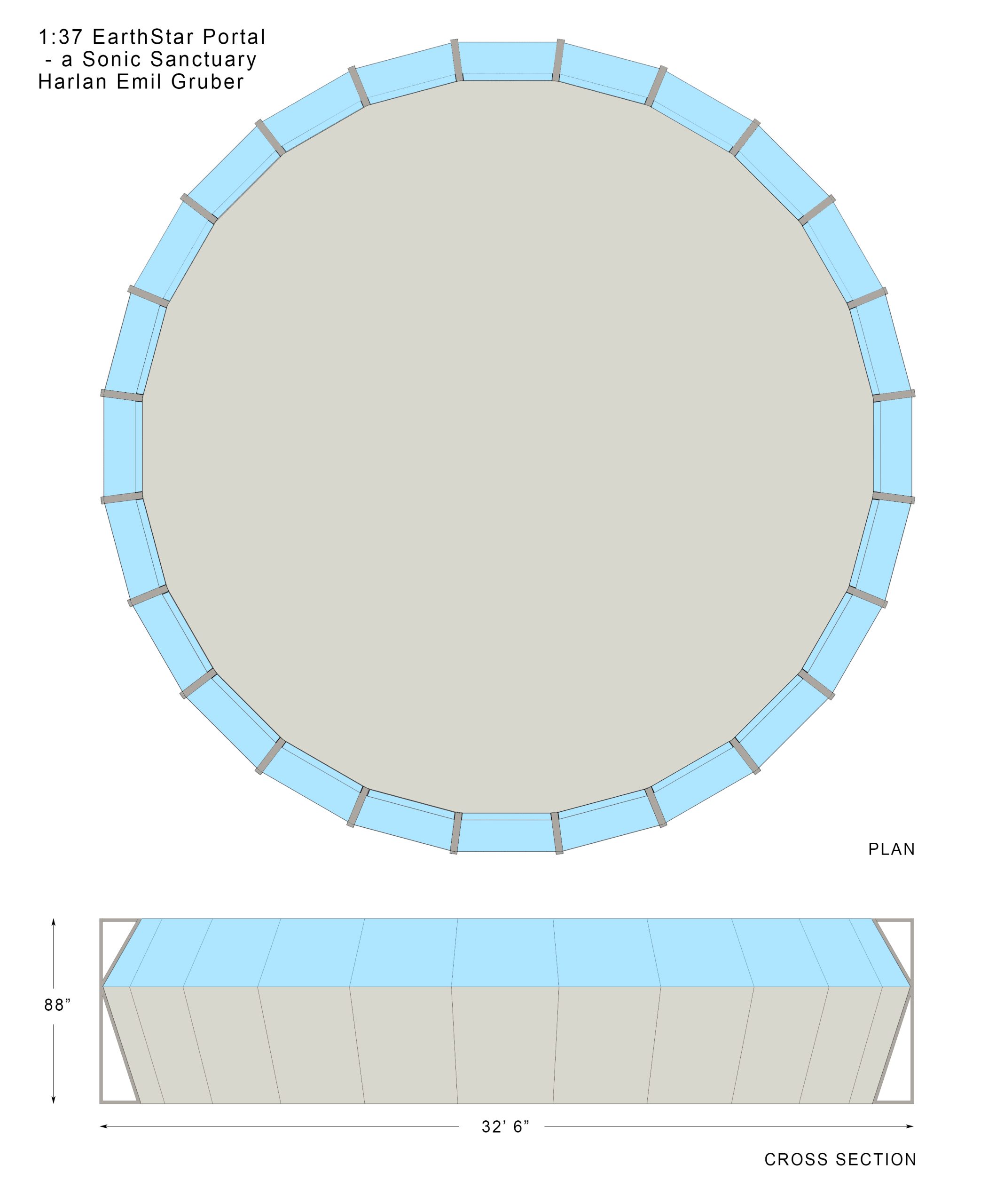 It consists of twenty-four plywood panels in a circle sitting on earth colored outdoor carpet. The 96” height is divided at the golden ratio, the lower 59” slopes outward at the 72º angle of the Sky Portal, but is painted earthen color of the Alcyone Portal and the upper 37” slopes inward at the 60º angle of the Alcyone Portal but is painted the sky blue of the Sky Portal. The lower panel facing east is missing as an entrance to the interior. The upper inward sloping panels frame the sky: our star the sun in the daytime, and the stars at night. Thus the name Earth Star Portal. There will be dim white LEDs the brightness of star around this opening and a few dispersed in the upper panel, making it blend with the night sky.