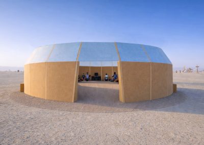 A new and experimental addition is a noise cancelling sound system consisting of 4 to six subwoofers and full range speakers mounted around the perimeter that will act like noise cancelling headphones and pick up the ambient background sound of Burning Man play a phase cancelled signal to make the space inside the Portal a much quieter “Sonic Sanctuary”